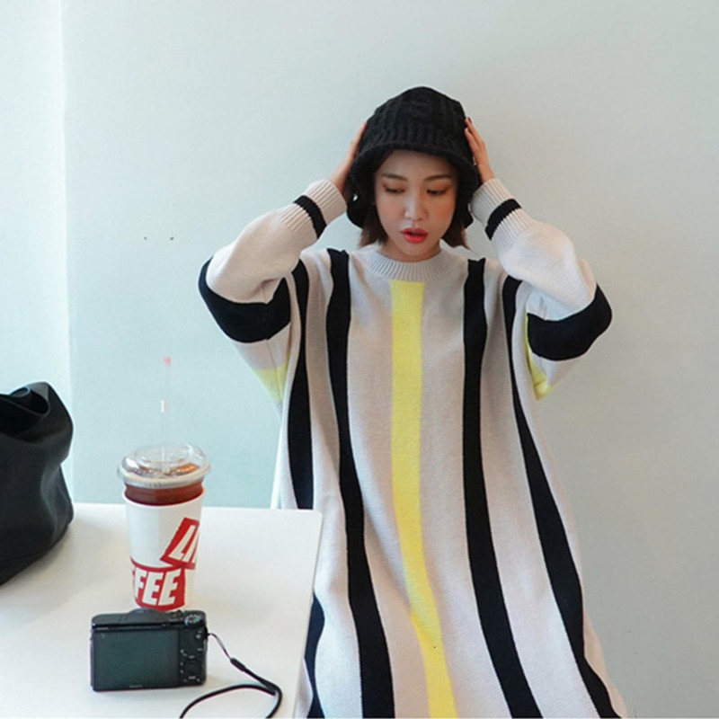 Autumn And Winter New Large Size Long Sweater Dress Women Loose Striped Knitted Sweater Korea Style Casual Knit Dresses 2021