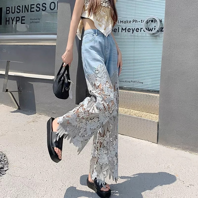 Summer New Loose And Versatile Hollow Out Lace Stitching Denim Pants Women High Waist Wide Leg Pants Female Casual Trousers