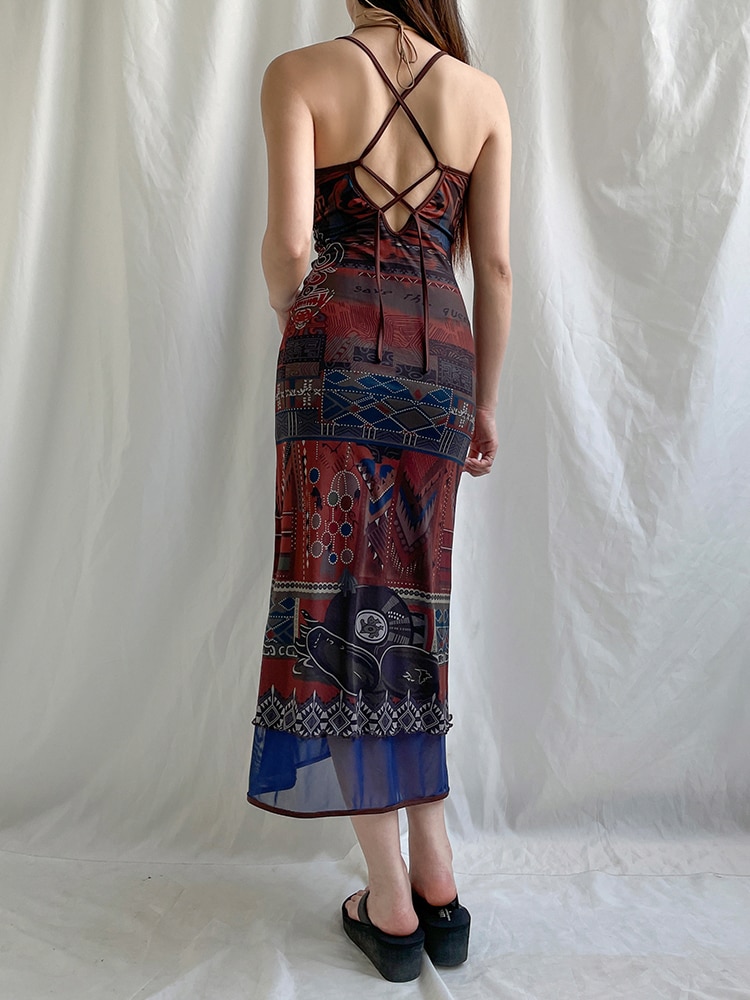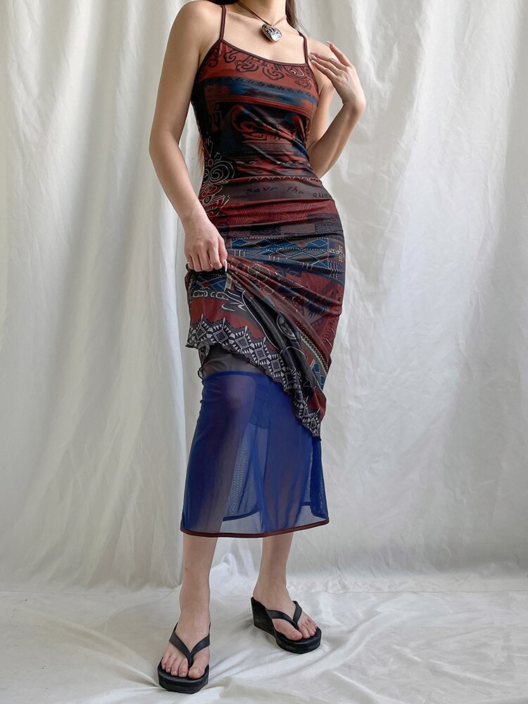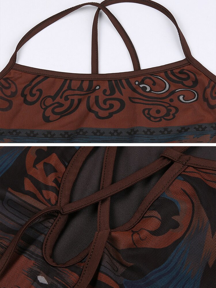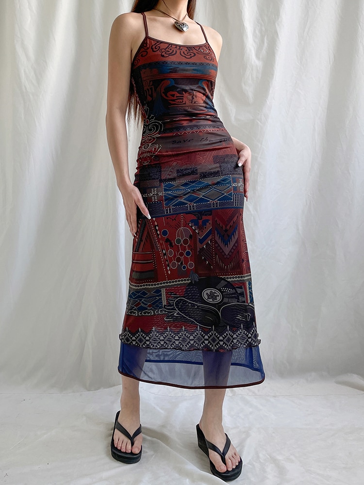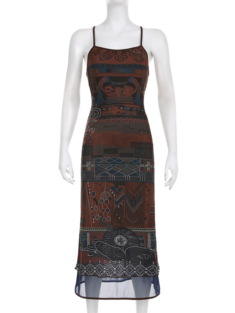 HEYounGIRL Vintage Mesh Long Dress Abstract Print Y2K Sleeveless Ankle-Length Women Dresses Strap Backless Holiday Dress 2000s