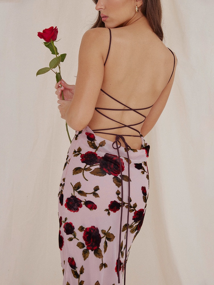 Mozision Elegant Floral Print Backless Maxi Dress For Women New Stretchy Mesh Strapless Lace-up Holiday Party Sexy Long Dress