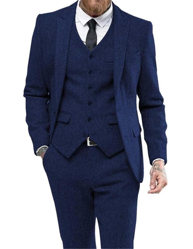 Men's Suits 3 Pieces Black Wool Herringbon Slim Fit Casual Formal Business Groomsmen Tweed Tuxedos for Wedding Blazer+Pants+Vest