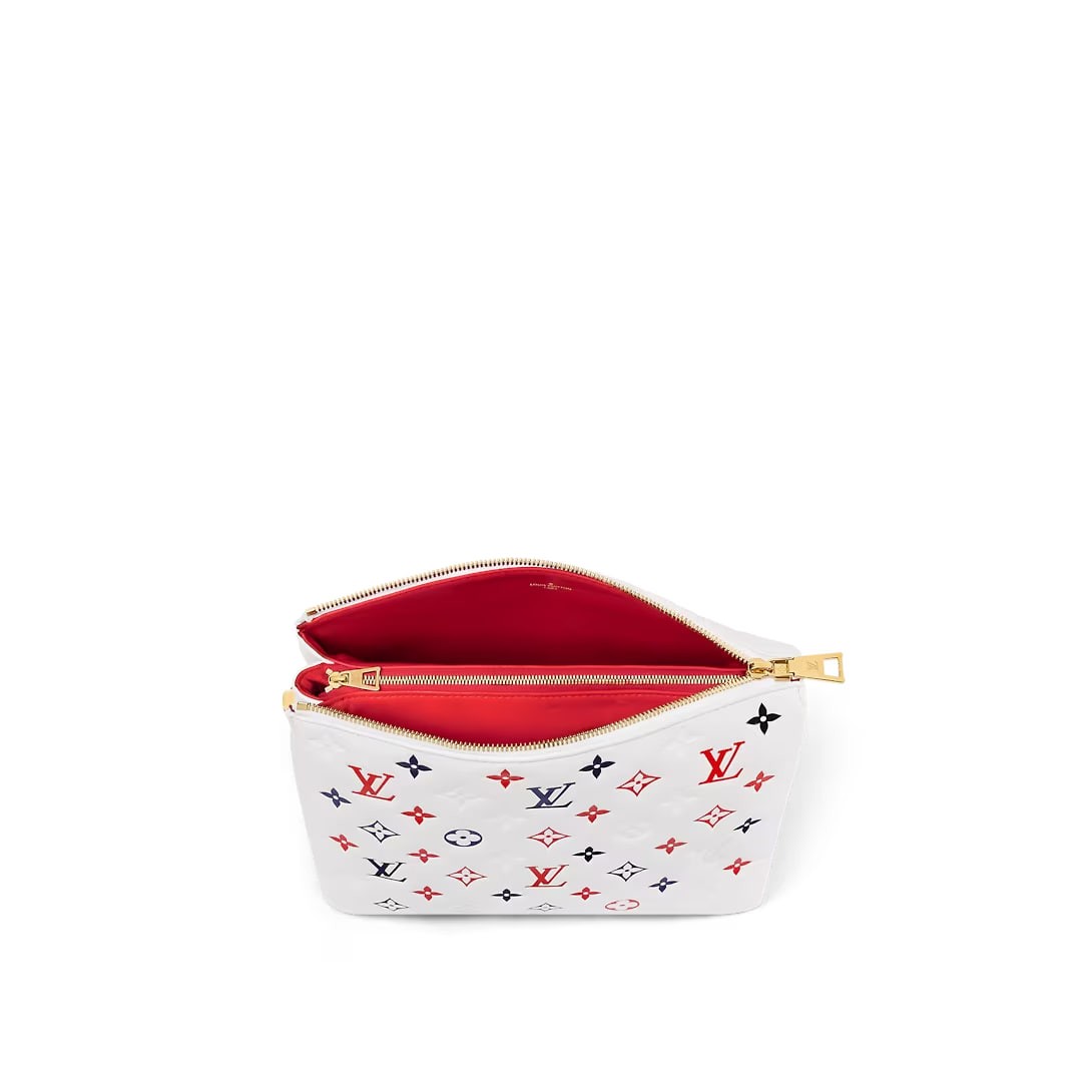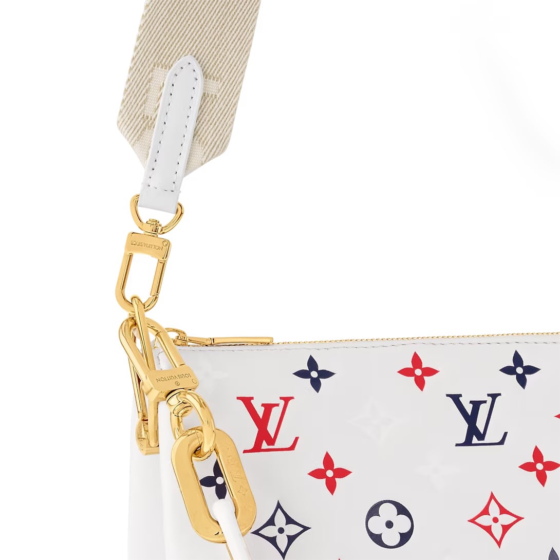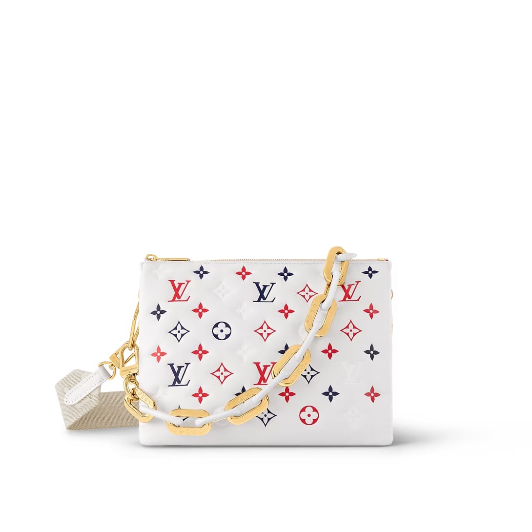 Crafted from puffed sheepskin, the Coussin PM bag impresses with a new version of the Monogram pattern in the signature colors of the French flag: red, white and blue. The metallic gold chain is accented with alternating blue and white embellishments on each link. The inside of the bag has a minimalist design with 1 zippered compartment in the middle, dividing the bag into 2 large compartments.