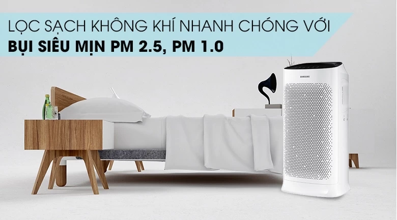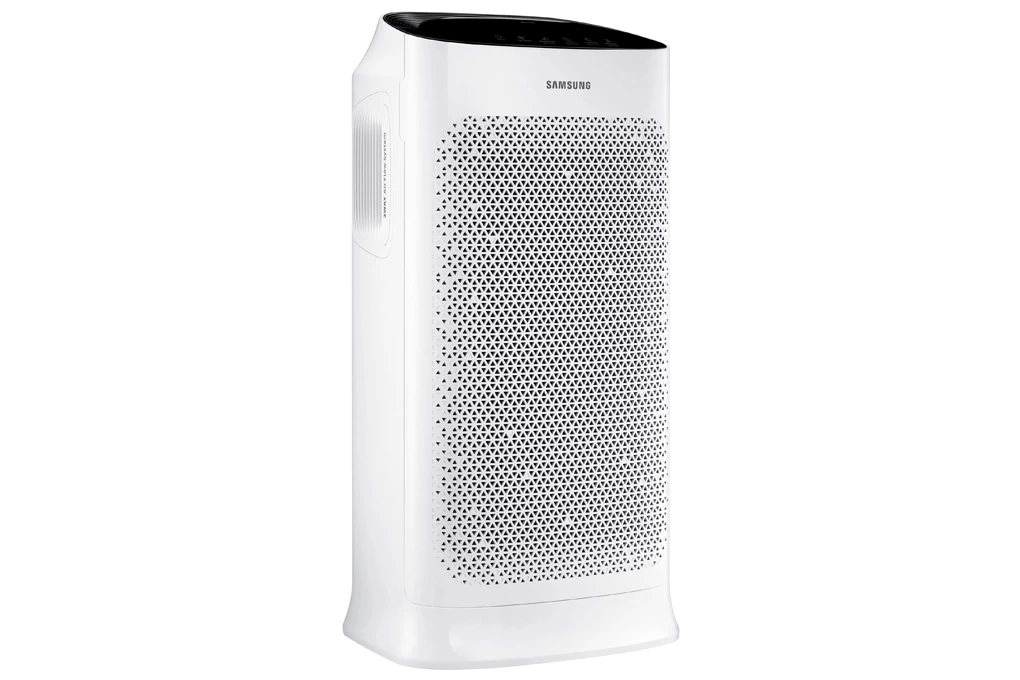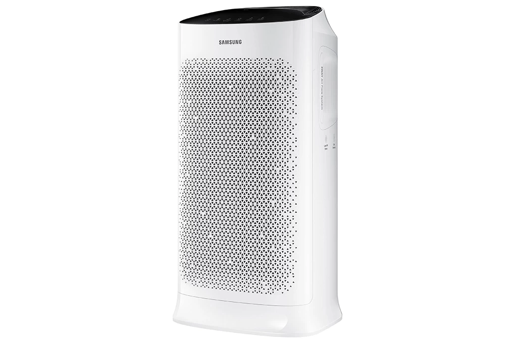 Máy lọc không khí Samsung kết cấu vững chắc, màu trắng đen sang trọng, có bánh xe di chuyển linh hoạt