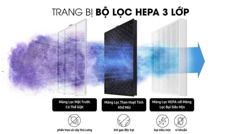 Bộ lọc gồm màng lọc bụi thô có thể giặt được, xử lý tốt bụi bẩn, phấn hoa, vảy thú cưng, màng lọc than hoạt tính khử mùi hôi, mùi khói thuốc lá, khí gas độc hại và màng lọc HEPA loại bỏ đến 99.97% vi khuẩn, bụi siêu mịn PM 1.0, PM 2.5.