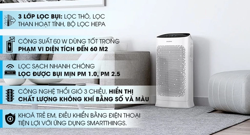 Máy lọc không khí có công suất 60W cho phạm vi lọc không khí tối ưu đến 60 m2, thích hợp dùng trong phòng khách, phòng ngủ, phòng bếp,...